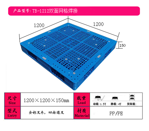 成型工艺:注塑双面网格焊接成型; ①、塑料托盘采用新料卡板质轻坚固、稳定性好,装载性能强; ②、美观,无钉刺、无味无毒、易清洗消毒、耐腐蚀、不霉烂、等优点; ③、适合频繁周转作业,使用寿命通常是木质卡板的5~7倍; ④、可回收再利用,符合环保要求,包装货物出口可免植物检疫证书、免熏蒸消毒证书,省时方便。 |