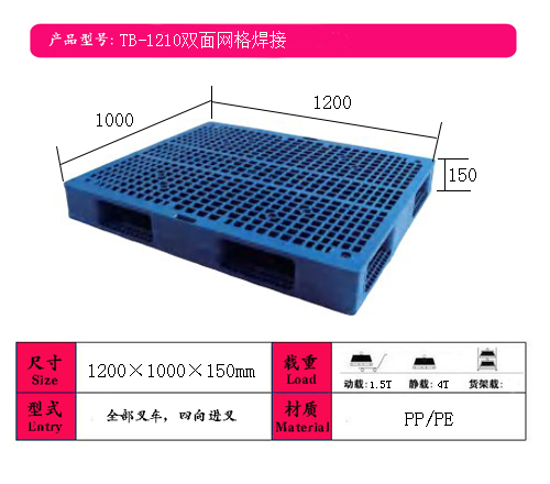 成型工艺:注塑双面网格焊接成型; ①、塑料托盘采用新料卡板质轻坚固、稳定性好,装载性能强; ②、美观,无钉刺、无味无毒、易清洗消毒、耐腐蚀、不霉烂、等优点; ③、适合频繁周转作业,使用寿命通常是木质卡板的5~7倍; ④、可回收再利用,符合环保要求,包装货物出口可免植物检疫证书、免熏蒸消毒证书,省时方便。 |