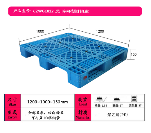 尺 寸:1000*1200*150mm反川字网格(可内置8根钢管); 适用范围:食品、烟草、医药、造纸、酒店、电子电器、化工、纺织、仓储物流等行业广泛使用。 优 点 :塑料托盘采用新料卡板质轻坚固、稳定性好,装载性能强;美观,无钉刺、无异味、易清洗消毒、耐腐蚀、不 霉烂等优点;适合频繁周转作业,使用寿命通常是木质卡板的5~7倍;可回收再利用,符合环保要求,包装货物出 口可免植物检疫证书、免熏蒸消毒证书,省时方便,是出口企业解决欧美国家禁止木质包装的理想替代。 |