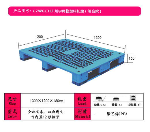 尺 寸:1300*1300*160mm(可内置12根钢管)组合款式; 适用范围:食品、烟草、医药、造纸、酒店、电子电器、化工、纺织、仓储物流等行业广泛使用。 优 点 :塑料托盘采用新料卡板质轻坚固、稳定性好,装载性能强;美观,无钉刺、无异味、易清洗消毒、耐腐蚀、不 霉烂等优点;适合频繁周转作业,使用寿命通常是木质卡板的5~7倍;可回收再利用,符合环保要求,包装货物出 口可免植物检疫证书、免熏蒸消毒证书,省时方便,是出口企业解决欧美国家禁止木质包装的理想替代。 |