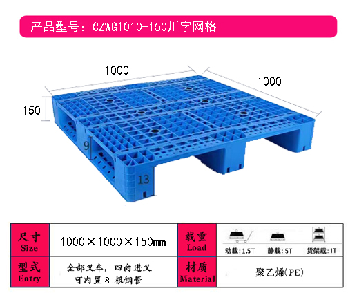 尺 寸:1000*1000*150mm(可内置8根钢管)组合款式; 适用范围:食品、烟草、医药、造纸、酒店、电子电器、化工、纺织、仓储物流等行业广泛使用。 优 点 :塑料托盘采用新料卡板质轻坚固、稳定性好,装载性能强;美观,无钉刺、无异味、易清洗消毒、耐腐蚀、不 霉烂等优点;适合频繁周转作业,使用寿命通常是木质卡板的5~7倍;可回收再利用,符合环保要求,包装货物出 口可免植物检疫证书、免熏蒸消毒证书,省时方便,是出口企业解决欧美国家禁止木质包装的理想替代。 |