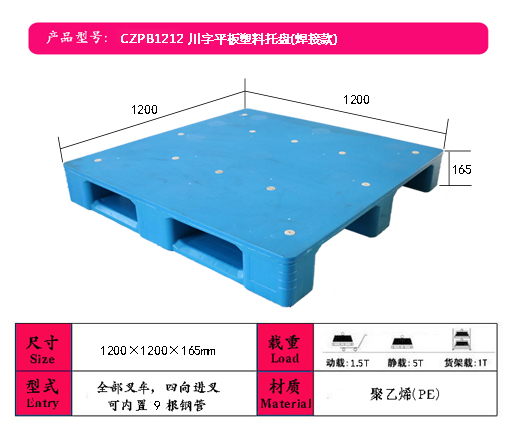 尺 寸:1200*1200*165mm(170mm)川字平板焊接款式; 材 质:新料(以蓝色为主,可定做其它颜色;黑色环保材料); 使用形: 四面进叉,适合平地、堆垛、货架使用; 适应温度:-25℃~+40℃(尽量避免阳光曝晒及靠近热源); 优 点 :塑料托盘采用新料卡板质轻坚固、稳定性好,装载性能强;美观,无钉刺、无异味、易清洗消毒、耐腐蚀、不霉烂等优点;适合频繁周转作业,使用寿命通常是木质卡板的5~7倍;可回收再利用,符合环保要求,包装货物出口可免植物检疫证书、免熏蒸消毒证书,省时方便,是出口企业解决欧美国家禁止木质包装的理想替代。 |