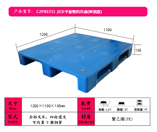 产品详细说明: 尺 寸:1200*1100*165mm(170mm)川字平板焊接款式; 材 质:新料(以蓝色为主,可定做其它颜色;黑色环保材料); 使用形: 四面进叉,适合平地、堆垛、货架使用; 适应温度:-25℃~+40℃(尽量避免阳光曝晒及靠近热源); 优 点 :塑料托盘采用新料卡板质轻坚固、稳定性好,装载性能强;美观,无钉刺、无异味、易清洗消毒、耐腐蚀、不霉烂等优点;适合频繁周转作业,使用寿命通常是木质卡板的5~7倍;可回收再利用,符合环保要求,包装货物出口可免植物检疫证书、免熏蒸消毒证书,省时方便,是出口企业解决欧美国家禁止木质包装的理想替代。
