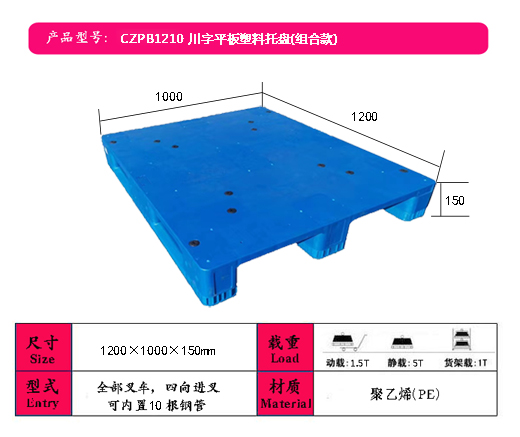 产品详细说明: 尺 寸:1200*1000*150mm/165mm川字平板组合款式; 材 质:新料(以蓝色为主,可定做其它颜色;黑色环保材料); 使用形: 四面进叉,适合平地、堆垛、货架使用; 适应温度:-25℃~+40℃(尽量避免阳光曝晒及靠近热源); 优 点 :塑料托盘采用新料卡板质轻坚固、稳定性好,装载性能强;美观,无钉刺、无异味、易清洗消毒、耐腐蚀、不霉烂等优点;适合频繁周转作业,使用寿命通常是木质卡板的5~7倍;可回收再利用,符合环保要求,包装货物出口可免植物检疫证书、免熏蒸消毒证书,省时方便,是出口企业解决欧美国家禁止木质包装的理想替代。
