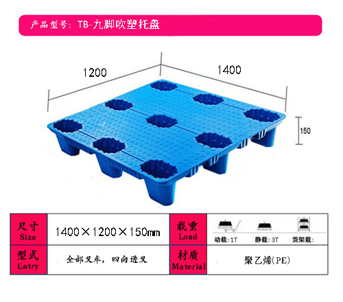 九脚吹塑塑料托盘特点: 1、优质产品,环保无害:防滑止动、防水、防晒、无利边钉刺、不伤产品、不伤手,质轻(易于搬运或储藏); 2、占用空间小,便于运输:易于堆叠,节省仓储和运输空间收敛,运输功能强大等优势; 3、强大的抗污能力:不发黑不发霉、清洁卫生、无毒性、无异味,防虫蛀; 4、安全、合格认证:真正低碳环保,符RosH货物出境要求免检通关; 5、耐摔,耐压,耐磨损:扛得住搬运工人或者叉车作业人员乱丢乱扔、经得起折腾; 6、超强承压,超长寿命:高轻度超负荷承载性能稳定,使用寿命长。 吹塑托盘是通过改进结构设计与采用特殊吹塑方法可以大幅度提高吹塑托盘的硬度与强度,并且可实现吹塑托盘表面平整,从而提高对使用环境的适应性能与使用寿命,可大幅度的降低使用成本。环保性能好:吹塑托盘无毒,耐酸碱盐的腐蚀,易于清洗消毒,不腐烂,同时废旧托盘可回收利用,符合环保要求。 |