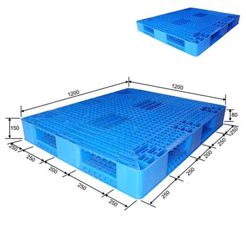 尺 寸:1200*1200*150mm; 材 质:新料(以蓝色为主,可定做其它颜色;黑色环保材料); 使用形: 四面进叉,适合平地周转、码垛使用; 适应温度:-25℃~+40℃(尽量避免阳光曝晒及靠近热源); 优 点 :塑料托盘采用新料卡板质轻坚固、稳定性好,装载性能强;美观,无钉刺、无味无毒、易清洗消毒、耐腐蚀、不霉烂、不助燃等优点;适合频繁周转作业,使用寿命通常是木质卡板的5~7倍;可回收再利用,符合环保要求,包装货物出口可免植物检疫证书、免熏蒸消毒证书,省时方便,是出口企业解决欧美国家禁止木质包装的首选。
