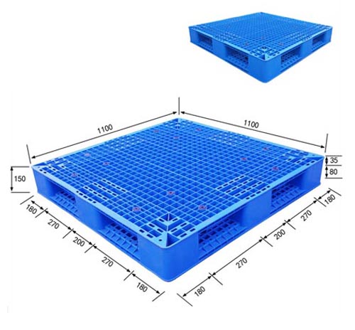 尺 寸:1100*1100*150mm; 材 质:新料(以蓝色为主,可定做其它颜色;黑色环保材料); 使用形: 四面进叉,适合平地周转、码垛使用; 适应温度:-25℃~+40℃(尽量避免阳光曝晒及靠近热源); 优 点 :塑料托盘采用新料卡板质轻坚固、稳定性好,装载性能强;美观,无钉刺、无味无毒、易清洗消毒、耐腐蚀、不霉烂、不助燃等优点;适合频繁周转作业,使用寿命通常是木质卡板的5~7倍;可回收再利用,符合环保要求,包装货物出口可免植物检疫证书、免熏蒸消毒证书,省时方便,是出口企业解决欧美国家禁止木质包装的首选。