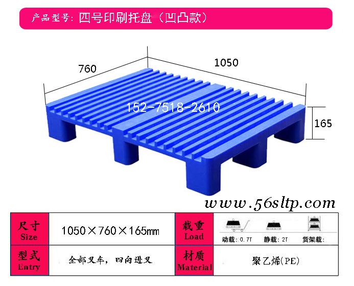 产品详细说明: 尺 寸:1050*760*165mm; 动载:0.7T, 静载:1.5T; 材 质:新料(以蓝色为主,可定做其它颜色;黑色环保材料); 使用形: 四面进叉,适合平地周转使用; 适应温度:-25℃~+40℃(尽量避免阳光曝晒及靠近热源); 优 点 :塑料托盘采用新料卡板质轻坚固、稳定性好,装载性能强;美观,无钉刺、无味无毒、易清洗 消毒、耐腐蚀、不霉烂、不助燃等优点;适合频繁周转作业,使用寿命通常是木质卡板的5~7倍;可回收 再利用,符合环保要求,包装货物出口可免植物检疫证书、免熏蒸消毒证书,省时方便。 适用范围:印刷行业专用,表面带有凹槽,能很好地配合翻纸机器,做到不卡纸,生产流畅。 |